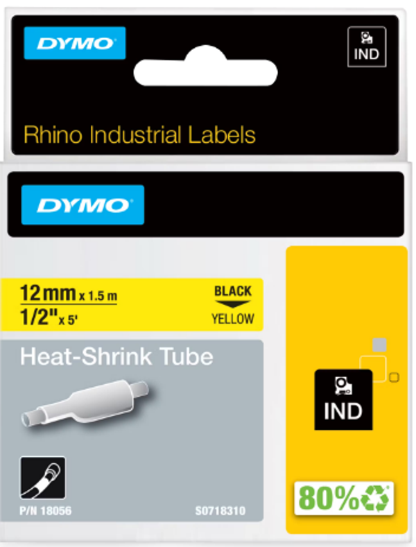 De DYMO 18056 Industrial Rhino Label is een krimpkous speciaal ontworpen voor complexe kabelidentificatie in industriële omgevingen. Dit product is een tape met een krimpverhouding van 3:1, wat betekent dat het krimpt tot een derde van zijn oorspronkelijke diameter bij verhitting. Het is geschikt voor kabels met een diameter van 3,0 mm tot 7,2 mm. De label is zwart op geel, wat zorgt voor een hoge zichtbaarheid van de tekst.