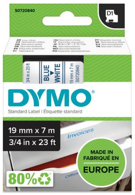 De DYMO S0720840 (ook bekend als 45804) is een D1 labelcassette ontworpen voor DYMO LabelManager- en LabelPoint-printers. Deze cassette biedt duurzame, heldere labels met blauwe tekst op een witte achtergrond, ideaal voor het organiseren van bestanden, kabels, opslagbakken en meer. De labels zijn bestand tegen vocht, UV-licht en extreme temperaturen, wat zorgt voor langdurige en betrouwbare prestaties, zelfs in uitdagende omgevingen.